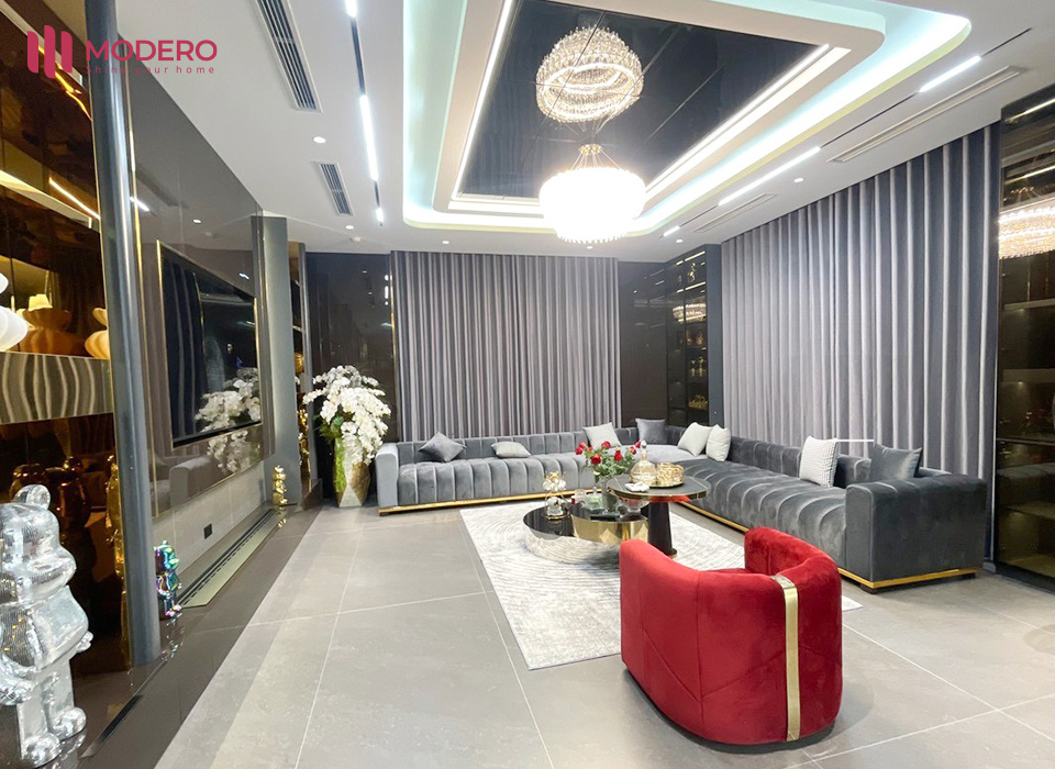 Trong phong cách hiện đại - sang trọng, việc bổ sung một số chi tiết ánh kim (gold/brass) hoặc đèn thủy tinh sẽ giúp không gian thêm phần lộng lẫy mà không phá vỡ sự tinh tế của gam xám lạnh.