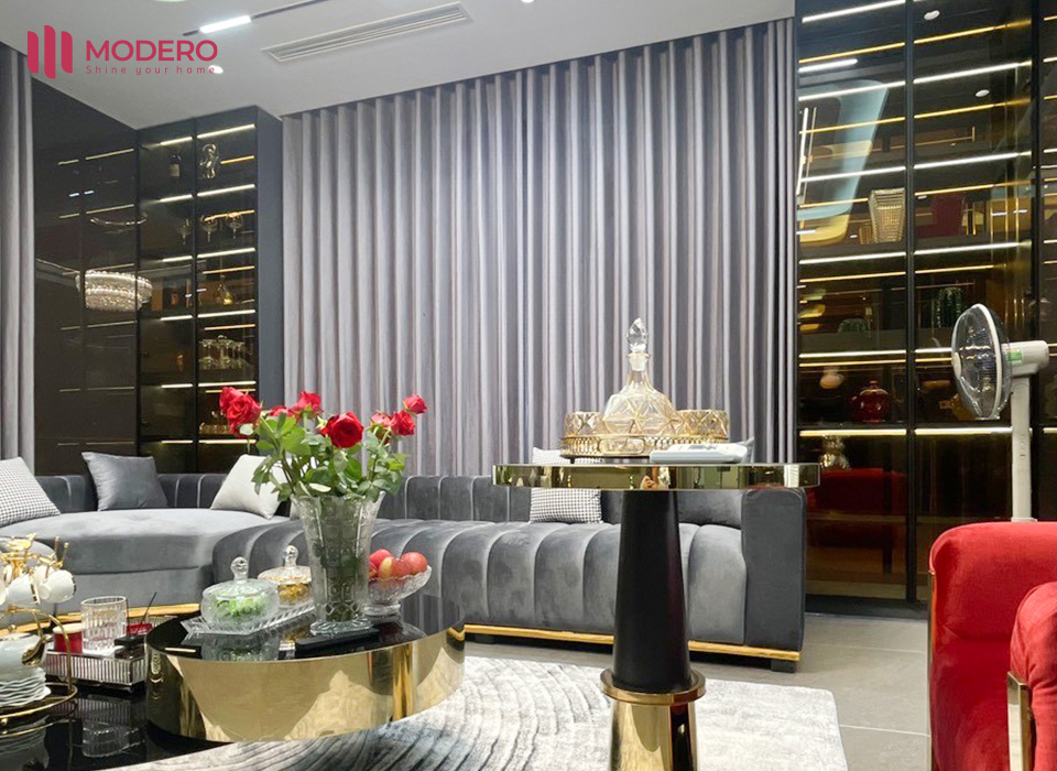 Màu xám lạnh vốn là gam trung tính “an toàn” nhưng lại chứa đựng chiều sâu thẩm mỹ. Nó không quá trầm như đen, cũng không quá sáng như trắng, mà nằm ở điểm cân bằng hoàn hảo. Điều này giúp rèm dễ dàng kết hợp với nhiều phong cách khác nhau: từ Scandinavian thanh lịch, Minimalism tối giản, cho đến Modern Luxury sang trọng. Trong công trình này, gam xám lạnh của rèm kết hợp hài hòa với nền tường trắng kem và bộ sofa nâu nhạt, tạo nên một tổng thể vừa nhẹ nhàng, vừa ấm áp.